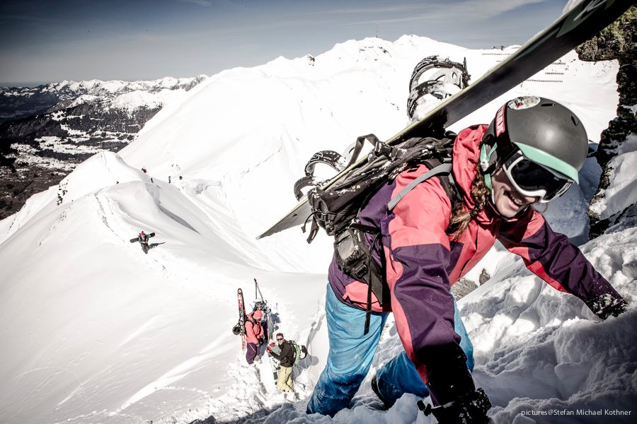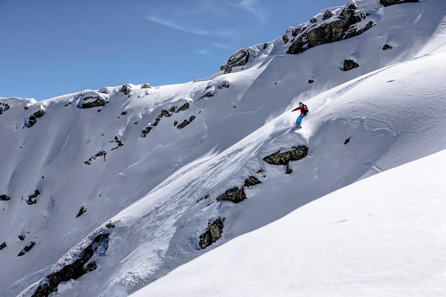 The main event should have taken place on Sunday, but there were very strong winds. The Event had to be canceled, because in case of a heavy injury it would have been impossible to rescue the rider per helicopter. The good thing was that there was a bunch of great snowboarders and skiers on the mountain. We did some hiking on the qualification face from the day before and managed to track the whole resort. Montafon is actually a good resort for freeriding, even though there no extremely long runs, but they have very interesting terrain and one can find everything from relatively flat powderruns to steep and technical lines. The faces also offer different exposures, which is another benefit, because of diverse sun and wind effects on the snow.